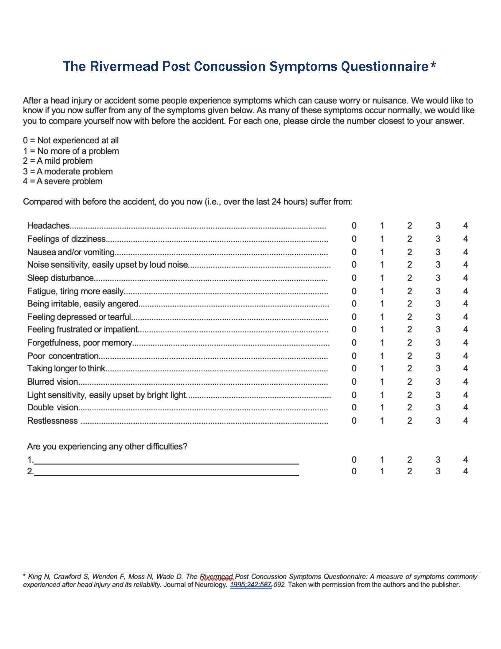 Citation: King NS, Crawford S, Wenden FJ, Moss NE, Wade DT. The Rivermead Post Concussion Symptoms Questionnaire: a measure of symptoms commonly experienced after head injury and its reliability. J Neurol. 1995 Sep;242(9):587-92. doi: 10.1007/BF00868811. PMID: 8551320.